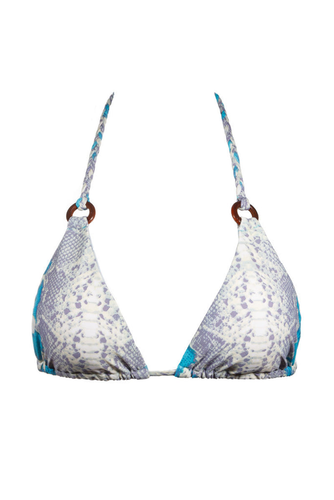 Sizzle this summer with the Snake Skin Print Top with Braided Strings by Envya. This suit will turn heads with its snake skin design, wooden ring accents, and braided side ties.