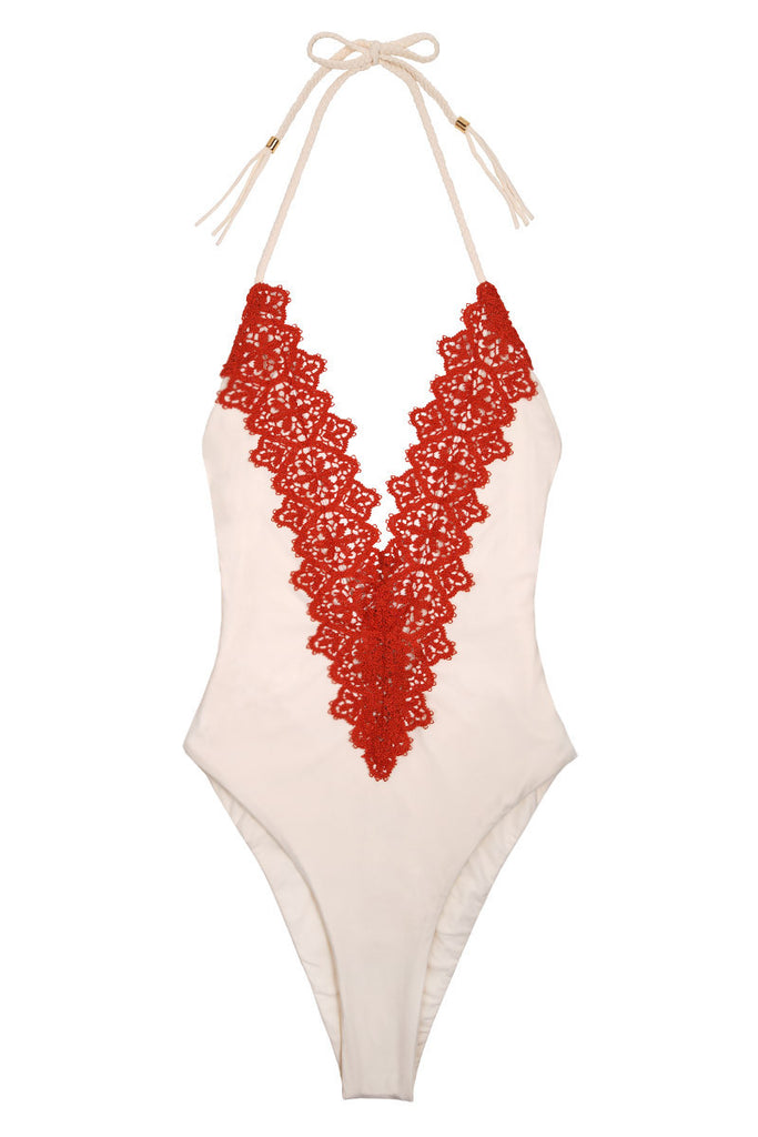 Take the plunge in the Mirage Halter One Piece Swimsuit in White Sands by Blue Life. This gorgeous and daring piece has a deep plunging V-neckline with lace appliqué, adjustable halter ties around the neck, and an open back with an adjustable tie at mid-back.